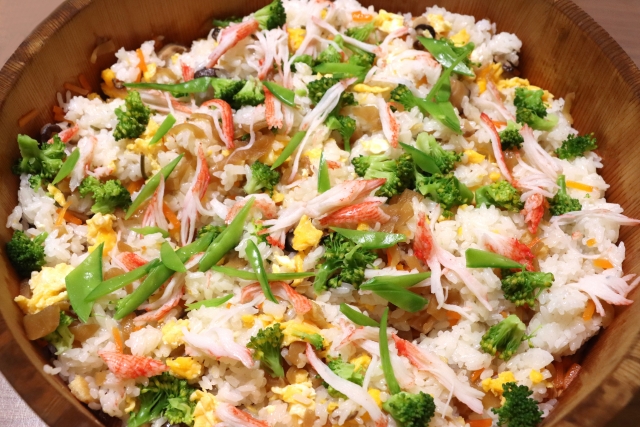 15 Evenly distribute the cooked vegetables and eel over the sushi rice, mix gently, and transfer to serving dishes. Garnish with snow peas, sweet rolled omelette, and sweetened vinegar lotus root.